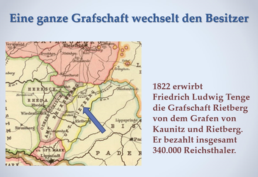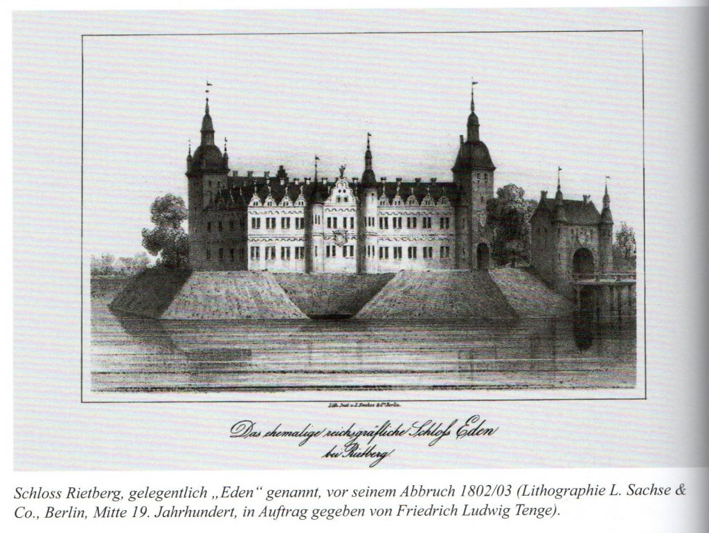 „Das ehemalige reichsgräfliche Schloß Eden bei Rietberg“ Schloss Rietberg, gelegentlich „Eden“ genannt, vor seinem Abbruch 1802/03 (Lithographie L. Sachse & Co., Berlin, Mitte 19. Jahrhundert, in Auftrag gegeben von Friedrich Ludwig Tenge).