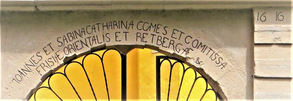 Namensinschrift der Erbauer aus dem Jahr 1616 auf dem Eingangsportal zum Schloss: JOHANNES ET SABINA CATHARINA COMES ET COMITISSA / FRISIAE ORIENTALISET RETBERGAE & (Johannes und Sabina Catharina Graf und Gräfin/ von Ostfriesland und Rietberg etc.)